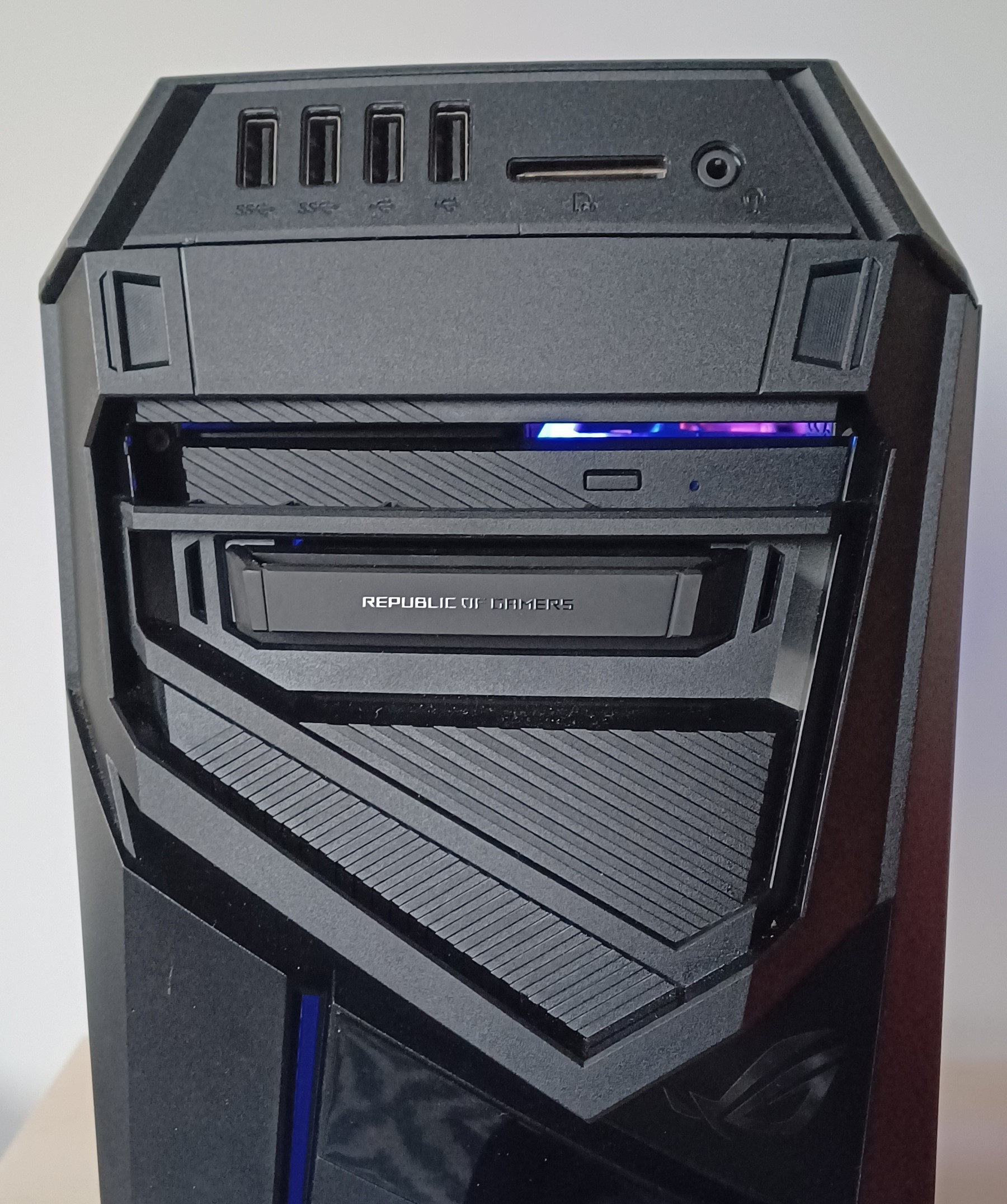 Proposer des PCs gamer sans qu'un ROG ne se trouve dans le catalogue serait dommage. Non pas que les ROG soient toujours d'une grande originalité. Rétrospectivement, en effet, ils demeurent assez classiques et possèdent même une tendance à se répéter: parallélépipède sombre doté de quelques led. Leur concurrent Alienware, par exemple, est plus innovatif et audacieux. Non, ROG, c'est d'abord un acronyme: "Republic Of Gamers". Un acronyme et une ambition. Tout gamer en effet possède le sens de la communauté gaming et oeuvre à ce qu'elle soit à la fois démocratique et conviviale. Bien sûr, il y existe d'innombrables individus toxiques mais tout corps social ne possède-t-il pas des éléments indésirables ? Puis, ROG, c'est un logo (ici en fond d'écran). Cet oeil sourcilleux, c'est l'oeil du gamer: un regard rapide et précis, ayant développé grâce au gaming, une capacité supérieure de suivre et gérer de multiples objets. Enfin, ROG, ce sont des PCs esthétiquement réussis dont certains atteignent les sommets de l'ingénierie et de la beauté.